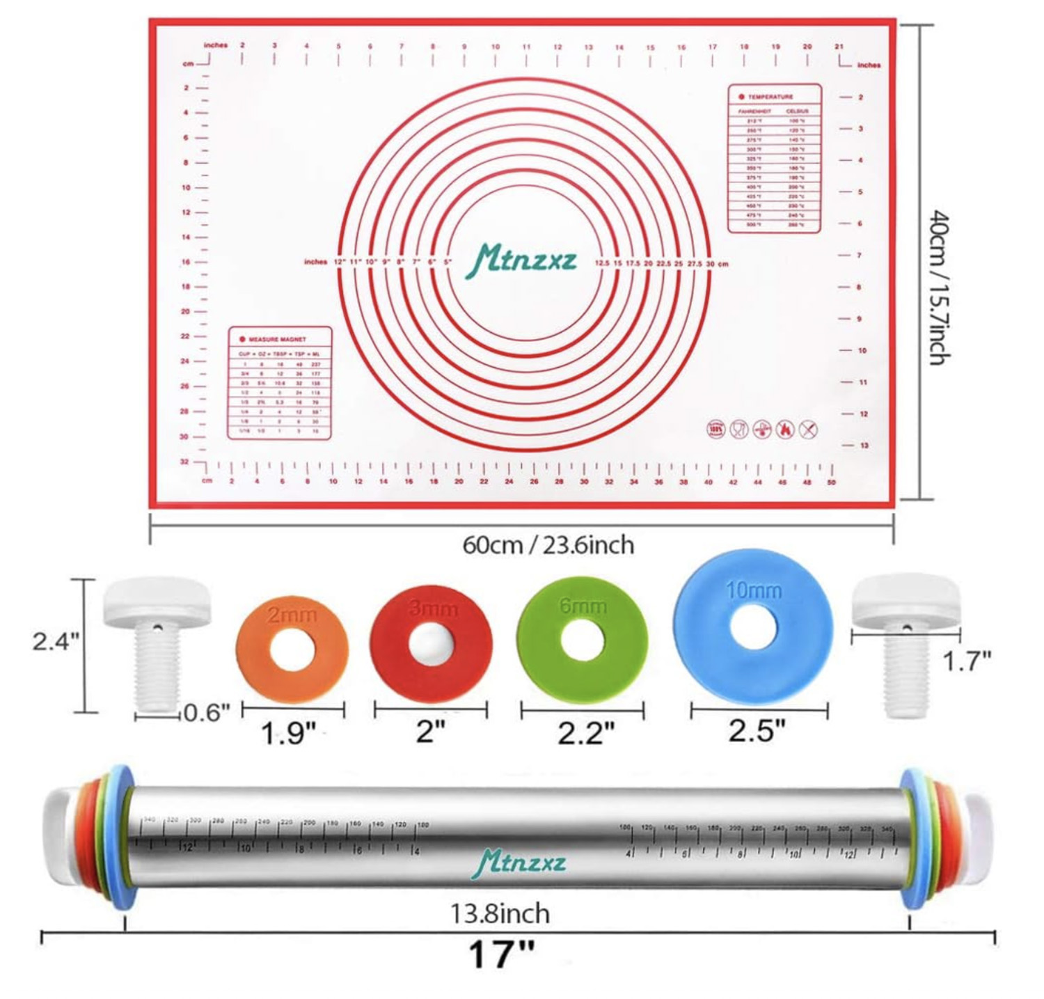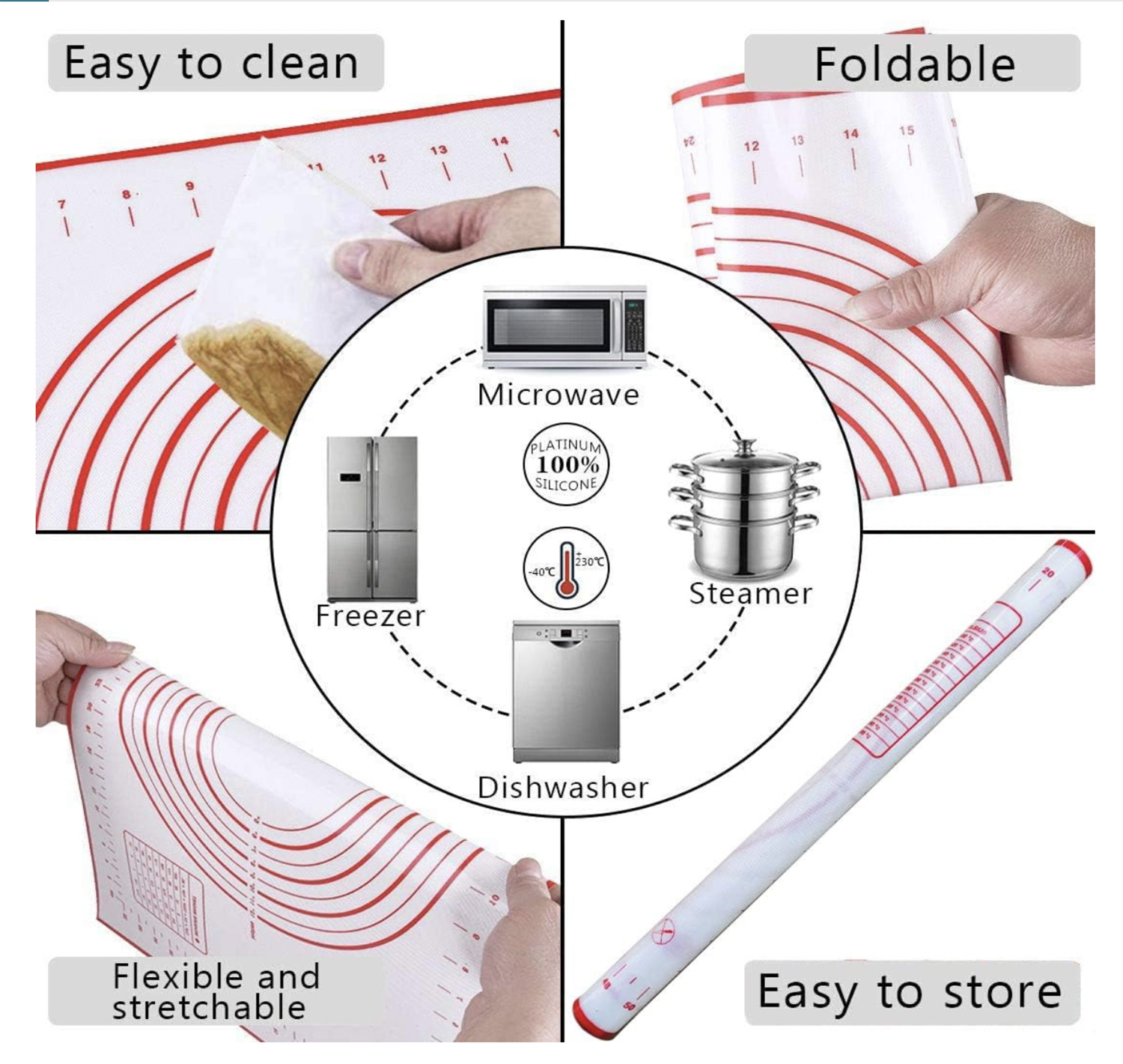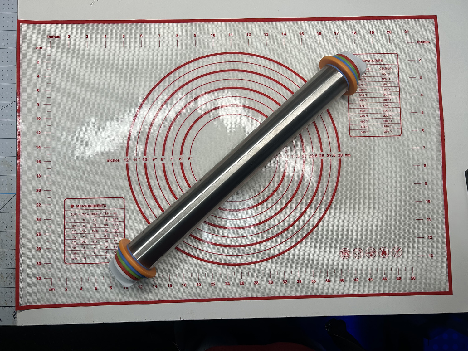 The silicone mat is easy to clean with a lot of measurements on it.