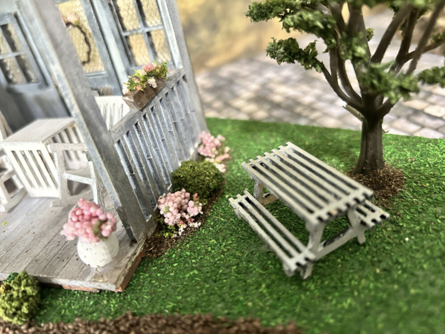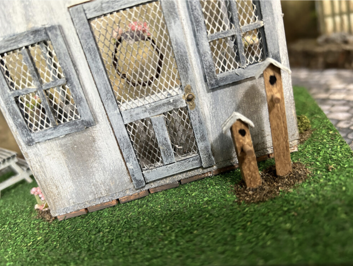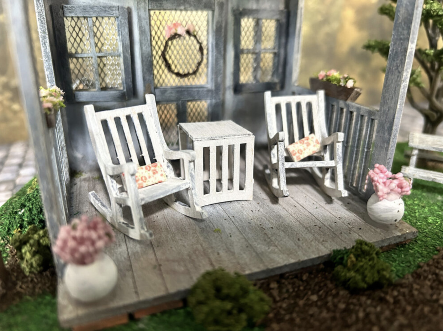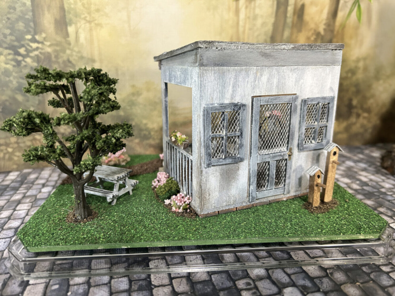 This darling little “She Shed” was a fun project to teach me patience while working with some of the tiny fiddly parts (grin). My joy has always come from building the main structure and then finishing the structure and landscaping. After working on these smaller decorative parts, I’m finding a growing sense of accomplishment from working with the smaller items.