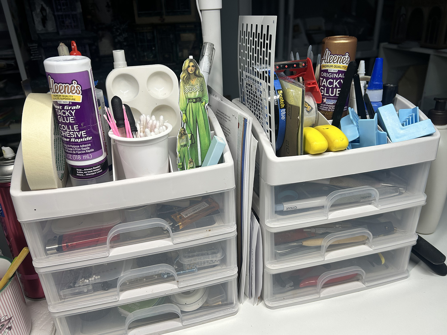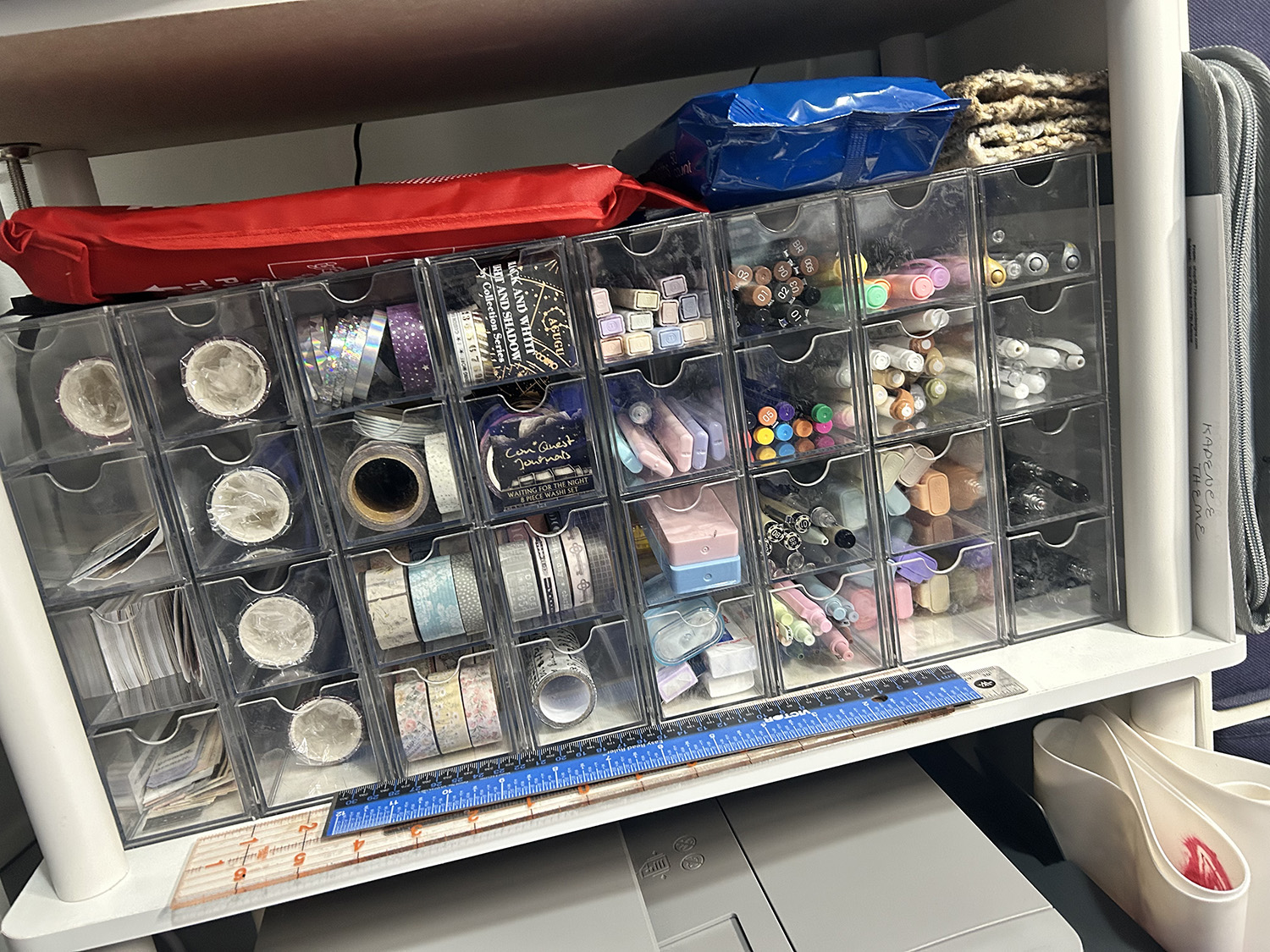 These clear acrylic drawers are the perfect size for pens and markers! I was not able to find an Amazon link for them, but each one has four drawers, and I believe four containers in a set.