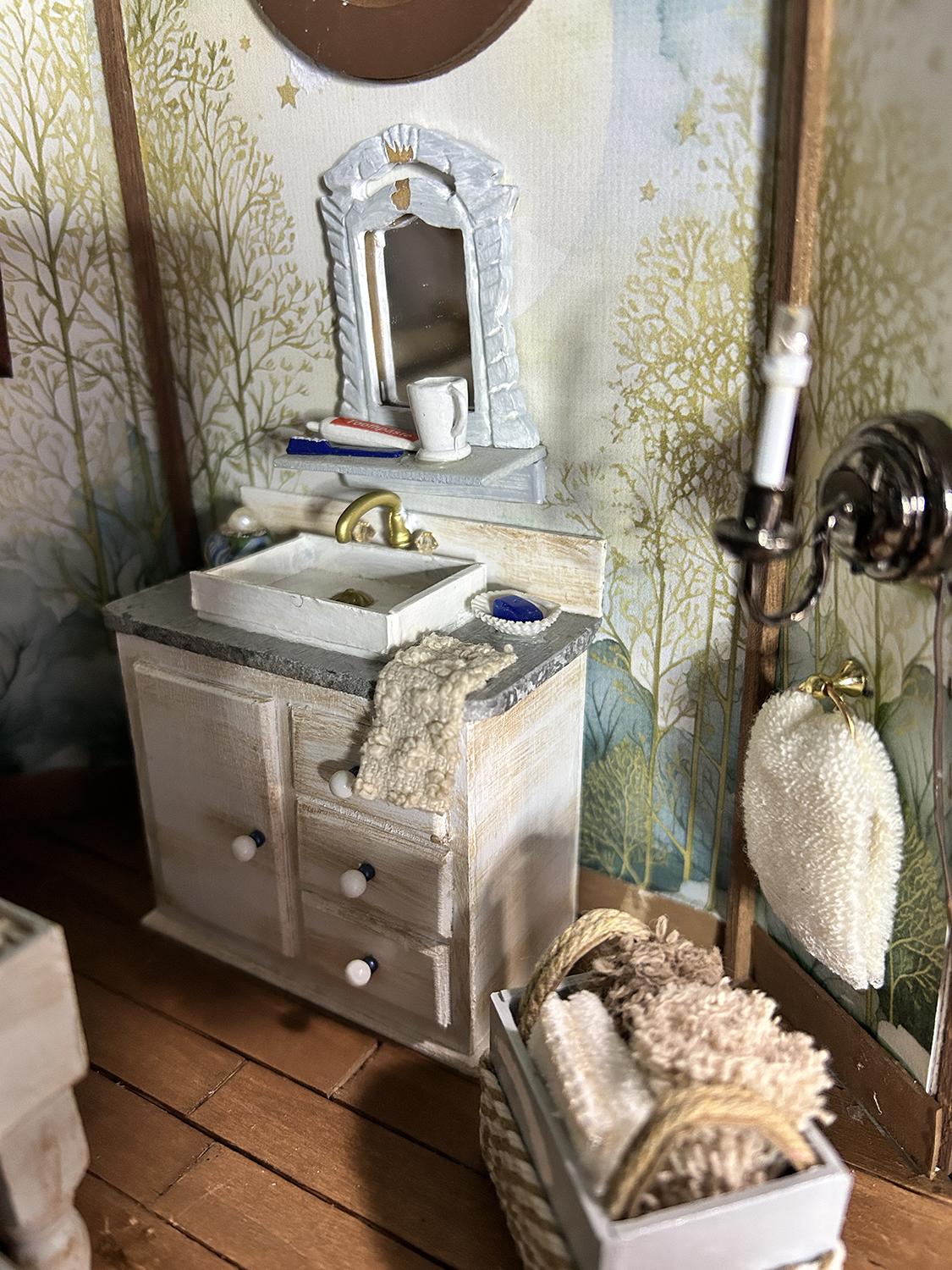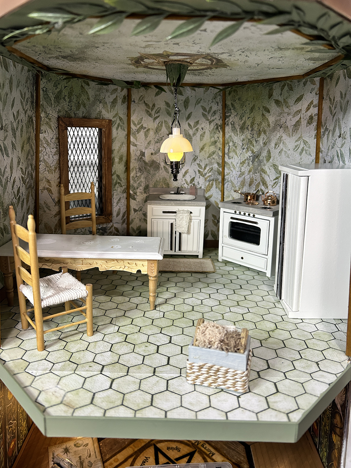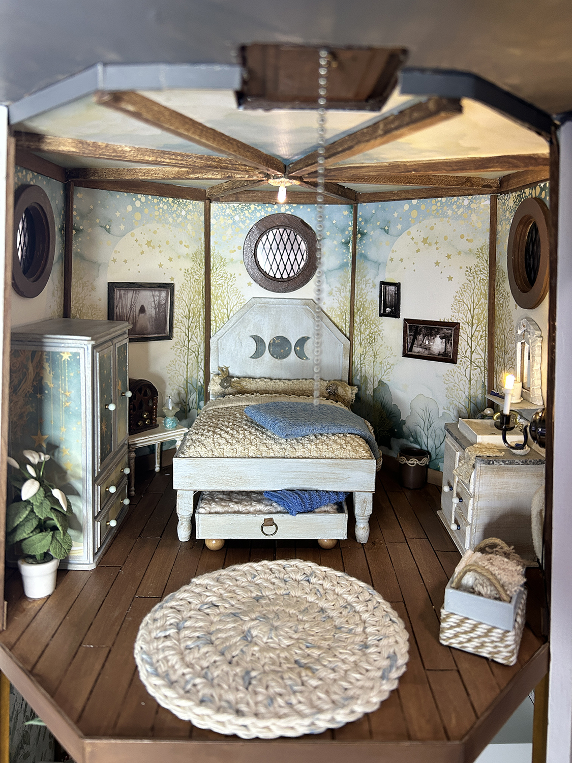 Something interesting happened this week! Matilda built a dresser for the bedroom, which was very nice but a bit plain, I thought. So after she was finished, I hand-painted the inset areas with the theme of the room. A local shop owner from town happened by while I was still painting and fell in love with the dresser. She has asked if we might consider building a few pieces to put in her shop. She seems to think they will sell well and only take 10% for the shop. We would love to give this a try using our own money and spare time. If you agree, we would happily give 25% of our sales to the coven. Let us know what you think, and here is a look at the finished dresser.